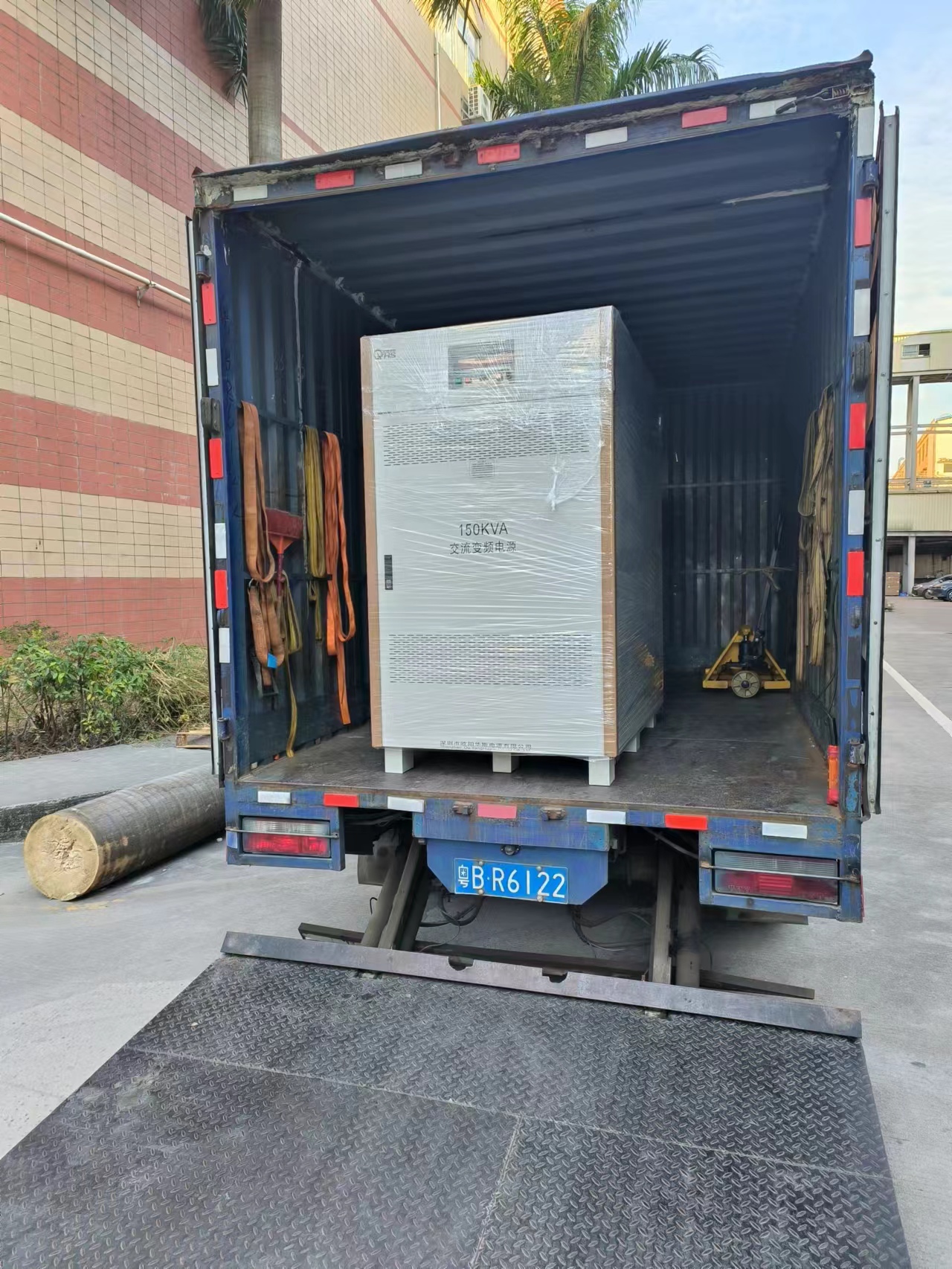 欧阳华斯150KVA变频电源出货深圳家电厂,输出120V 60HZ,测试出口小家电产品。