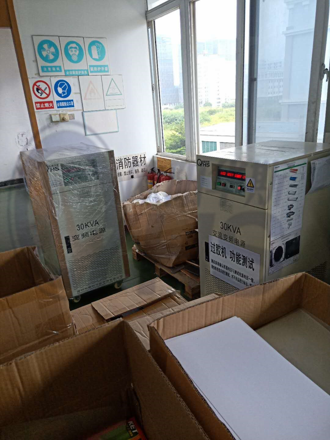 单进单30KVA变频电源出货深圳坪山客户现场,测试110V/60HZ,办公器材厂家,属于老客户,老机器还在运行生产,由于客户订单增多,一台30KVA变频电源不够用,又重新订购一台30KVA变频电源,
